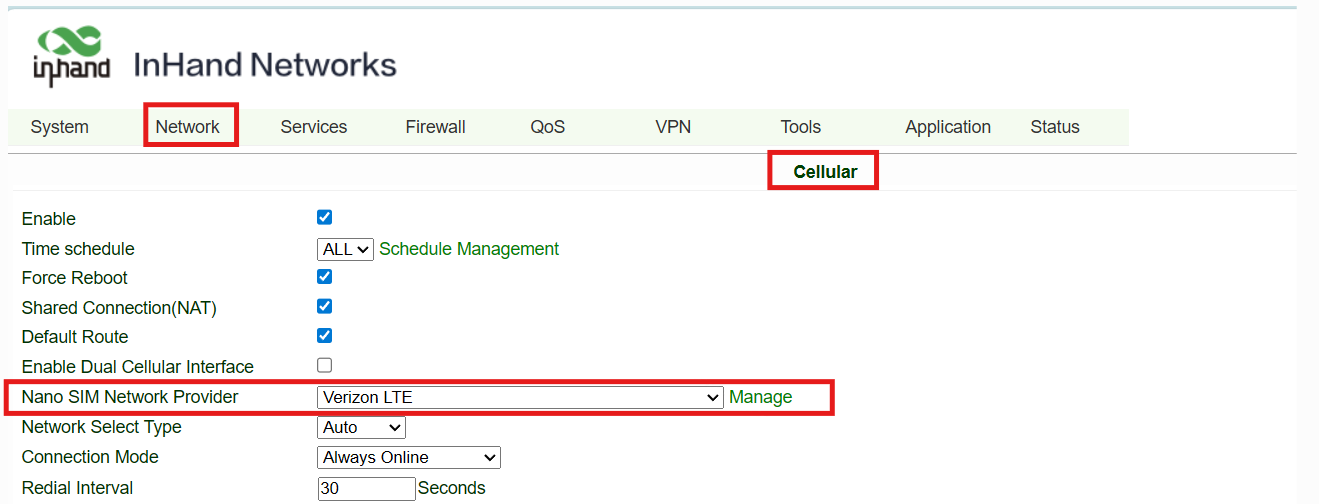 - At Nano SIM Network Provider, select Verizon LTE profile: