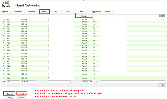 1. Go to Firewall=>Filtering. Click on Back up to download a template.