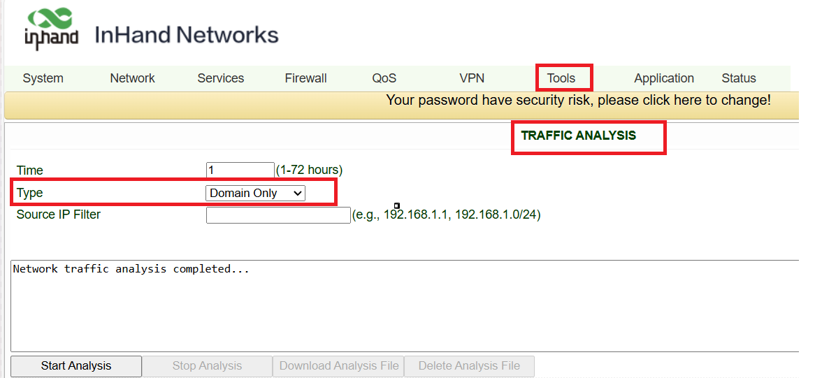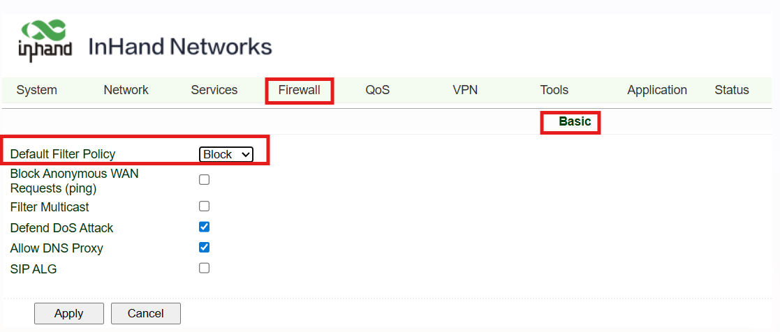 1. Go to Firewall=>Basic. The Default Filter Policy is Accept from the factory, which allows all traffic. If we want to restrict traffic and allow URLs on the whitelist only, please set Default Filter Policy to Block. Now, only the URLs in the whitelist at Filtering page can have access to the network.