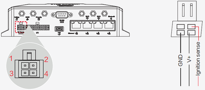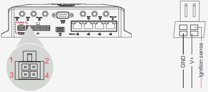 - Connect the ignition sense cable and the anode in parallel in DC Connector's Positive pin, and connect the GND in DC Connector's Negative pin.