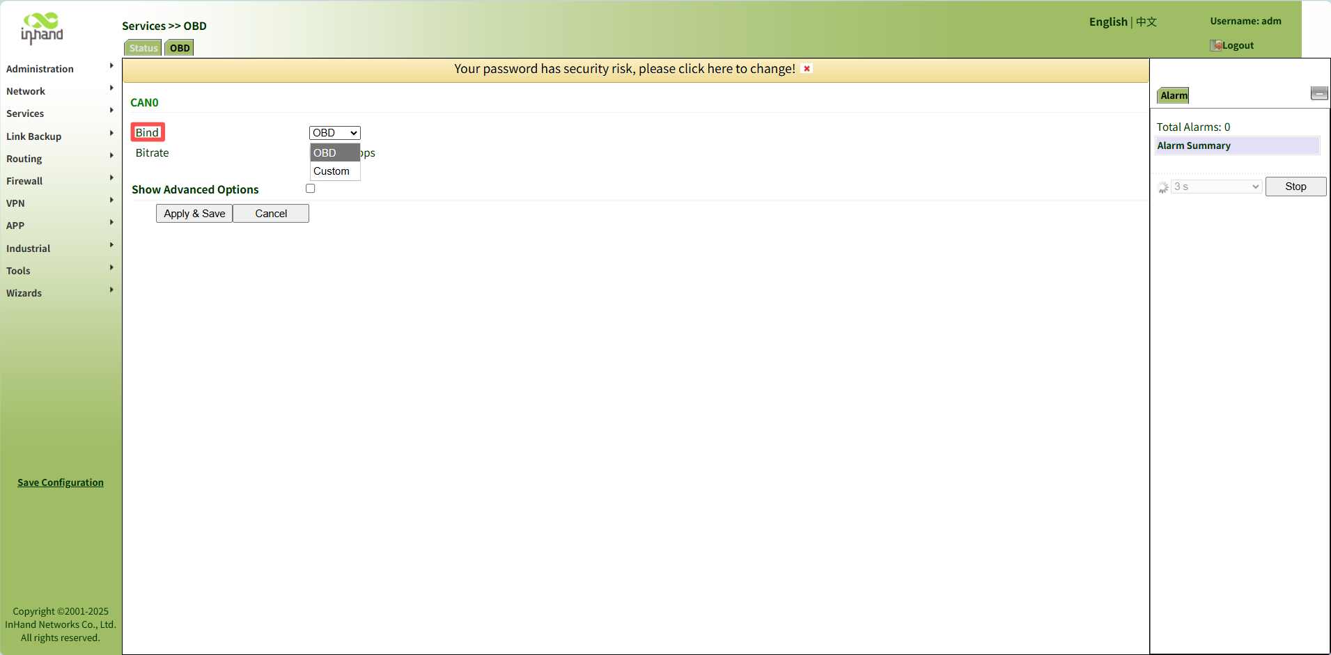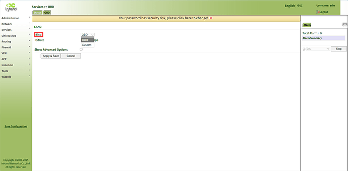 - Configuration: To use this, select "Bind OBD" in the frontend, then use the CLI to set the mode to 'listen' and specify the baud rate.