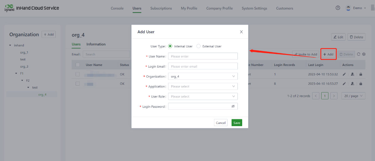 Click Users at the top of InCloud Manager to manage the organization and user information of the system.