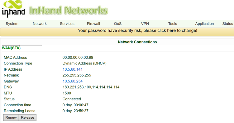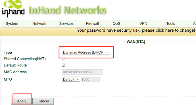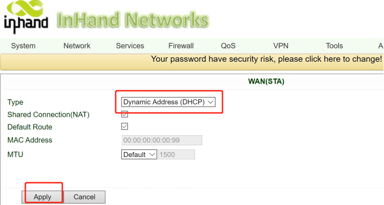 3) Go to Network >> WAN(STA), selectDHCP for WLAN connection.