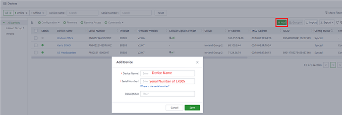 2. On InCloud portal, go to Devices. Click Add, then add device by Serial Number.