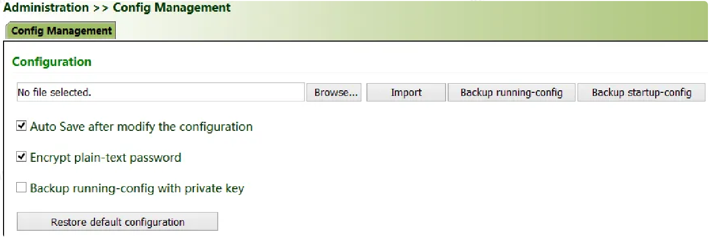Method for importing configurations: Click "Administration >> Config Management >> Config Management >> Browse", select a configuration file, and click Import to import the configuration file to the gateway.