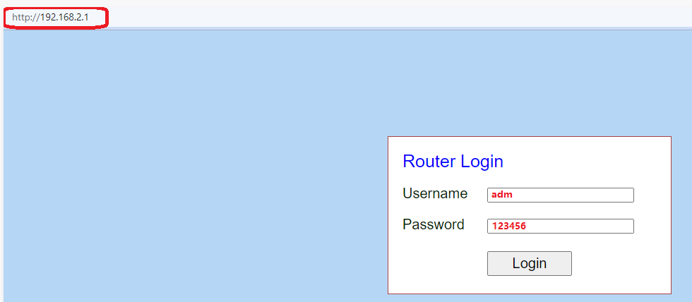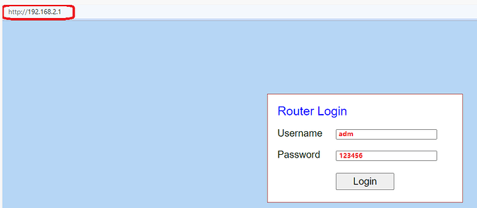 - Connect PC to router, open web browser and go to 192.168.2.1 (if this doesn't work, try incognito mode with http://192.168.2.1). Log in with default username and password on the label of the router (adm/123456)