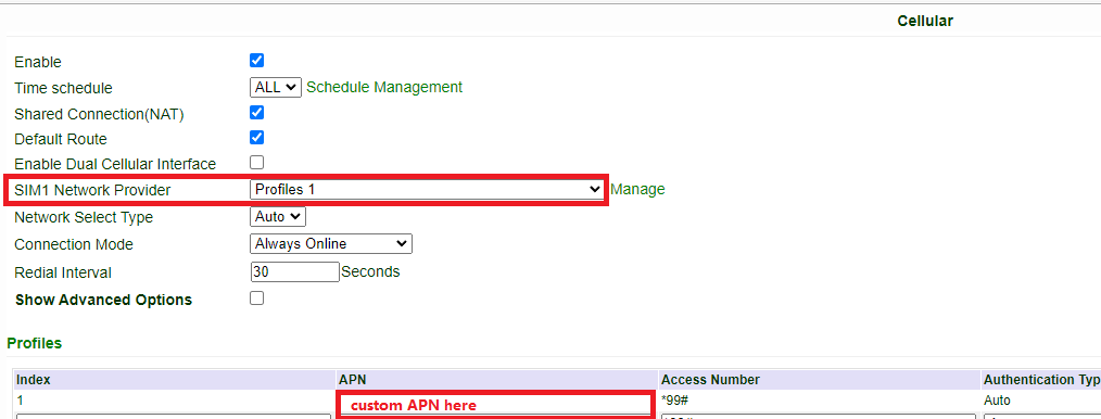 Scroll to the bottom of the page on the profiles table, click on the blank below APN to edit, set APN to desired value. Note: Make sure you click on the blank on the same row as Index 1.