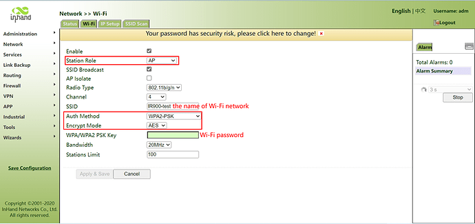3. Change the Station Role to AP. Change SSID if needed. Change Auth Method to WPA2-PSK. Change Encryption to AES. Change WPA/WPA2 PSK to what you want the password to be (8 character minimum). Hit Apply & Save.