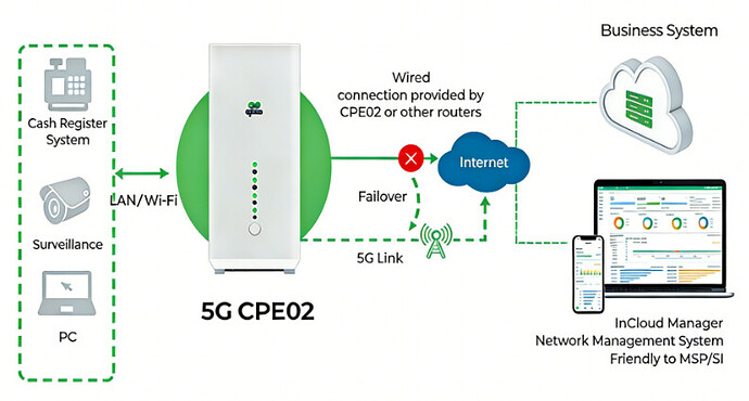 - Seamless Failover (Zero-Perception): When the primary broadband fails, the network must switch to the 5G backup link within seconds to ensure zero lag for critical services like payments.