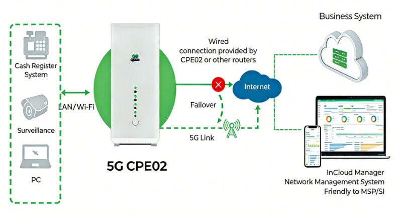 The CPE02 can function as a primary gateway for both wired and wireless connections or be seamlessly integrated into existing networks as a dedicated 5G backup solution. It establishes a "Dual-Network Intelligent Switching + Cloud-Device Synergy" architecture: