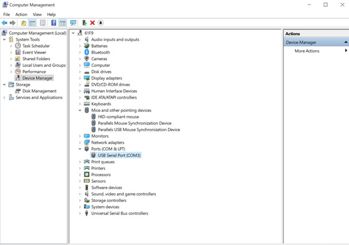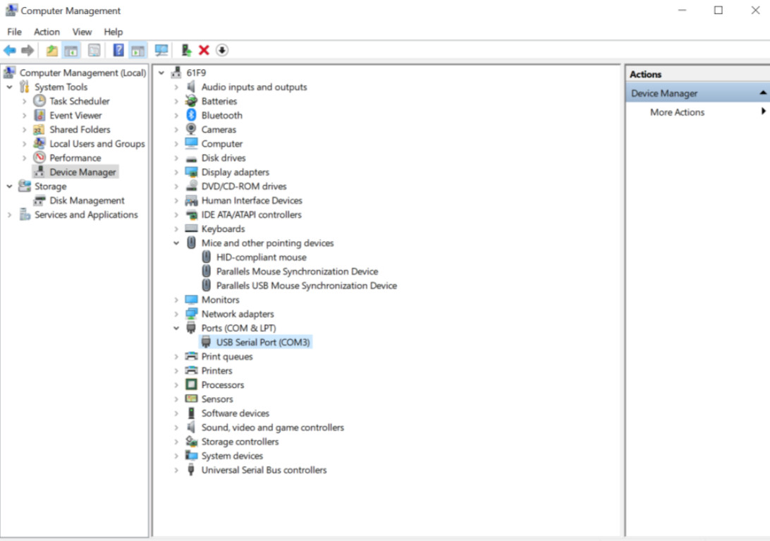 - Check PC Recognition (COM Port):Open Device Manager on your computer. Expand the "Ports (COM & LPT)" section and verify that the USB-to-Serial adapter is recognized and assigned a COM port number (as shown below).